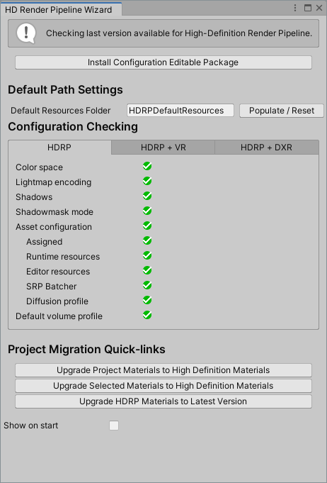 This tab provides you with configuration options to help you make your Unity Project use HDRP.