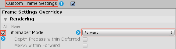 | Both | Use the Frame Settings to change between Forward and Deferred rendering mode on a per Camera basis. Selecting this increases Project build time. |