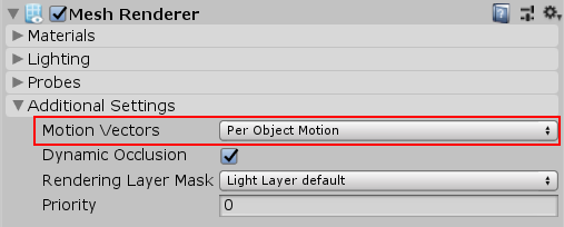 HDRP can now render motion vectors. If you enabled object motion vectors, be aware that, by default, new Mesh Renderers write object motion vectors. To change this behavior, select the Mesh Renderer and, in the Inspector, change the value of the Motion Vectors property.