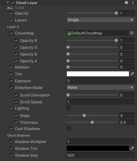 | - Opacity A | The opacity multiplier to apply to the Cloud Map's alpha channel. |