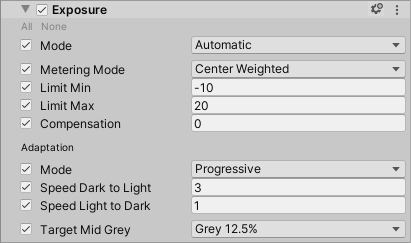 | Compensation | Set the value that the Camera uses to compensate the automatically computed exposure value. This is useful if you want to over or under expose the Scene. This works similarly to how exposure compensation works on most cameras. |