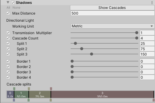 | Border 1 | Set the size of the border between the first and second cascade split. HDRP fades the shadow cascades between these two sections over this border.The Working Unit defines the unit this property uses. |