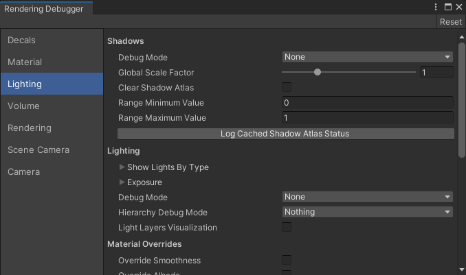 The Rendering panel has tools that you can use to visualize various HDRP rendering features.