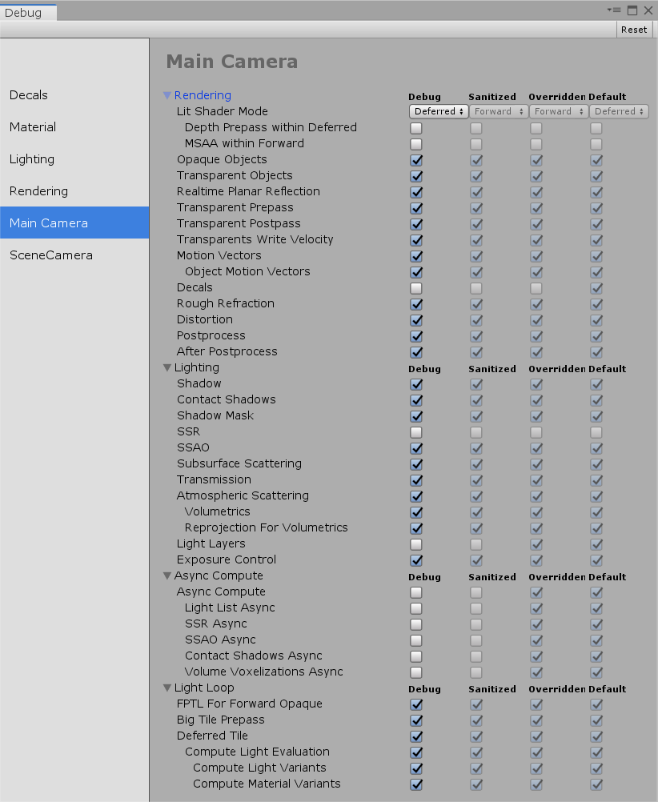 Unity processes Sanitized, Overridden, and Default in a specific order. First it checks the Default Frame Settings, then checks the selected Camera’s Overridden Frame Settings. Finally, it checks whether the HDRP Asset supports the selected Camera’s Frame Settings and displays that result in the Sanitized column.