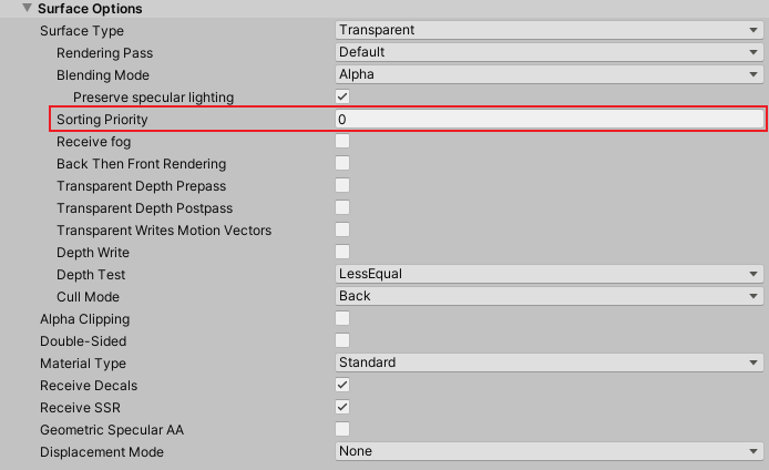 HDRP uses the Sorting Priority to sort GameObjects that use different Materials in your Scene. HDRP renders Materials with lower Sorting Priority values first. This means that Meshes using Materials with a higher Sorting Priority value appear in front of those using Materials with lower ones, even if Meshes using the first Material are further away from the Camera.