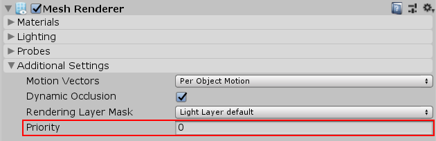 When you want to modify the render order for GameObjects using the same Material, use the Priority property in the Mesh Renderer’s Inspector. The Priority is a per-Renderer property that allows you to influence the rendering order for Renderers in your Scene.