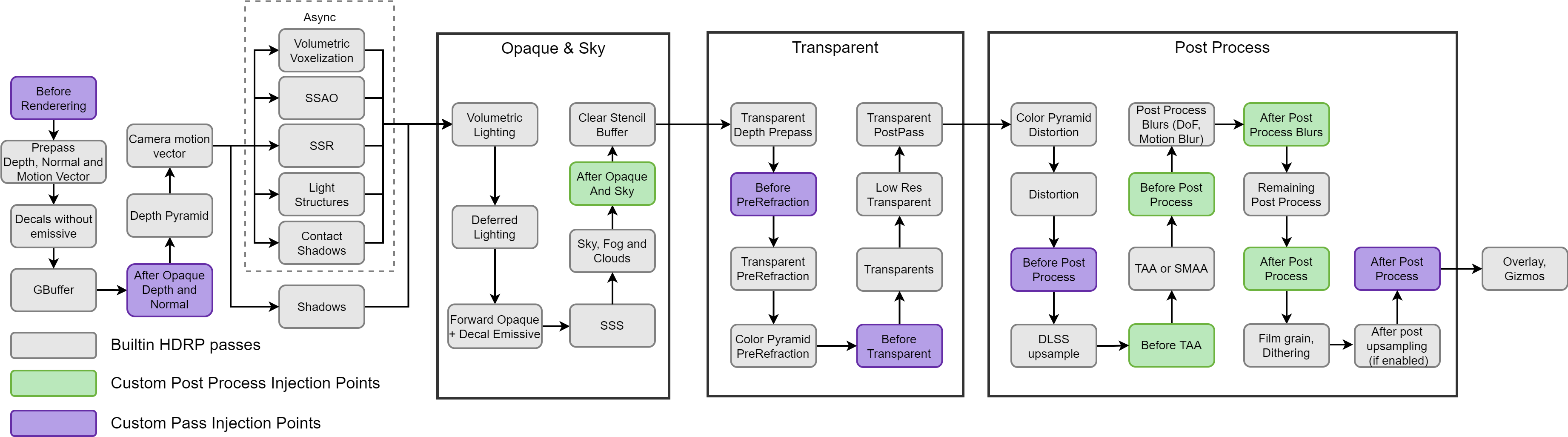 The following diagram describes where Unity injects Custom Passes into an HDRP frame: