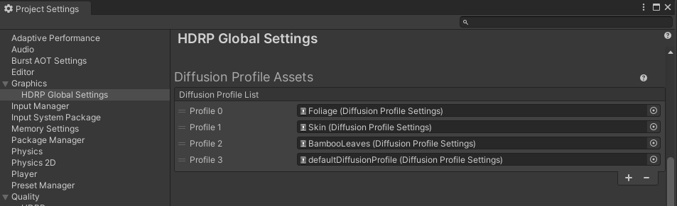 Use this section to select which custom Diffusion Profiles can be in view at the same time. To use more than 15 custom Diffusion Profiles in a Scene, use the Diffusion Profile Override inside a Volume. This allows you to specify which Diffusion Profiles to use in a certain area (or in the Scene if the Volume is global).