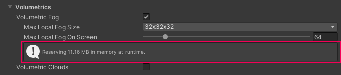 | Max Local Volumetric Fog Size | Controls the maximum resolution you can use for the Density Mask Texture. This setting can have a high impact on performance. The information box (highlighted in the image below) describes how much memory HDRP allocates for the Local Volumetric Fog system. |