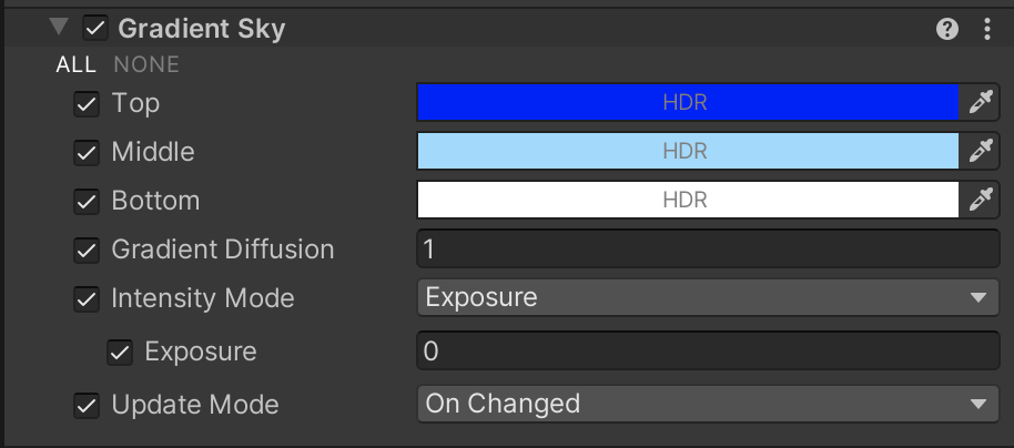 HDRP interpolates between these colors to create a gradient sky. You can alter these values at runtime.