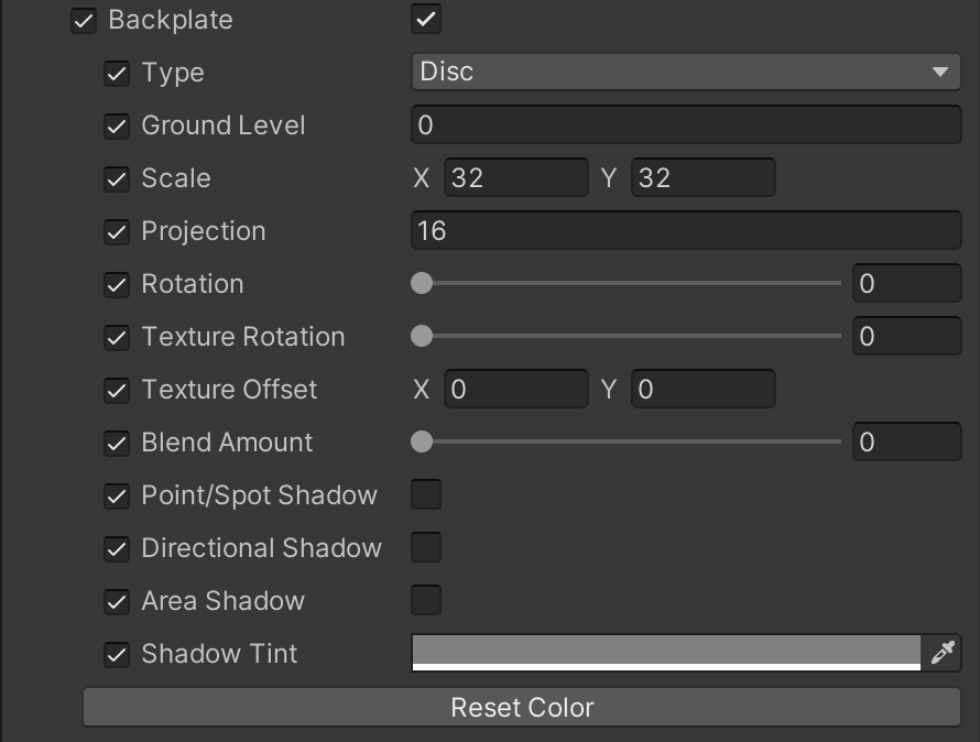 Point/Spot Shadow Indicates whether the backplate receives shadows from point/spot Lights.