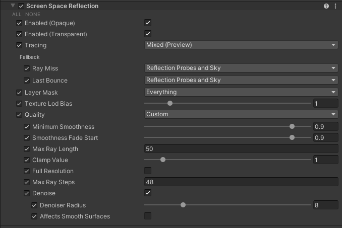 | Enable (Transparent) | Indicates whether HDRP processes SSR on transparent objects for Cameras in the influence of this effect's Volume. | |