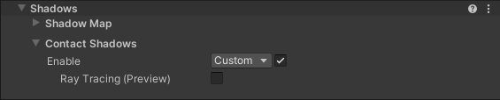 4. Select a Light and, in the Inspector, go to Shadows > Contact Shadows and tick the Enable checkbox. This exposes the Ray Tracing property.