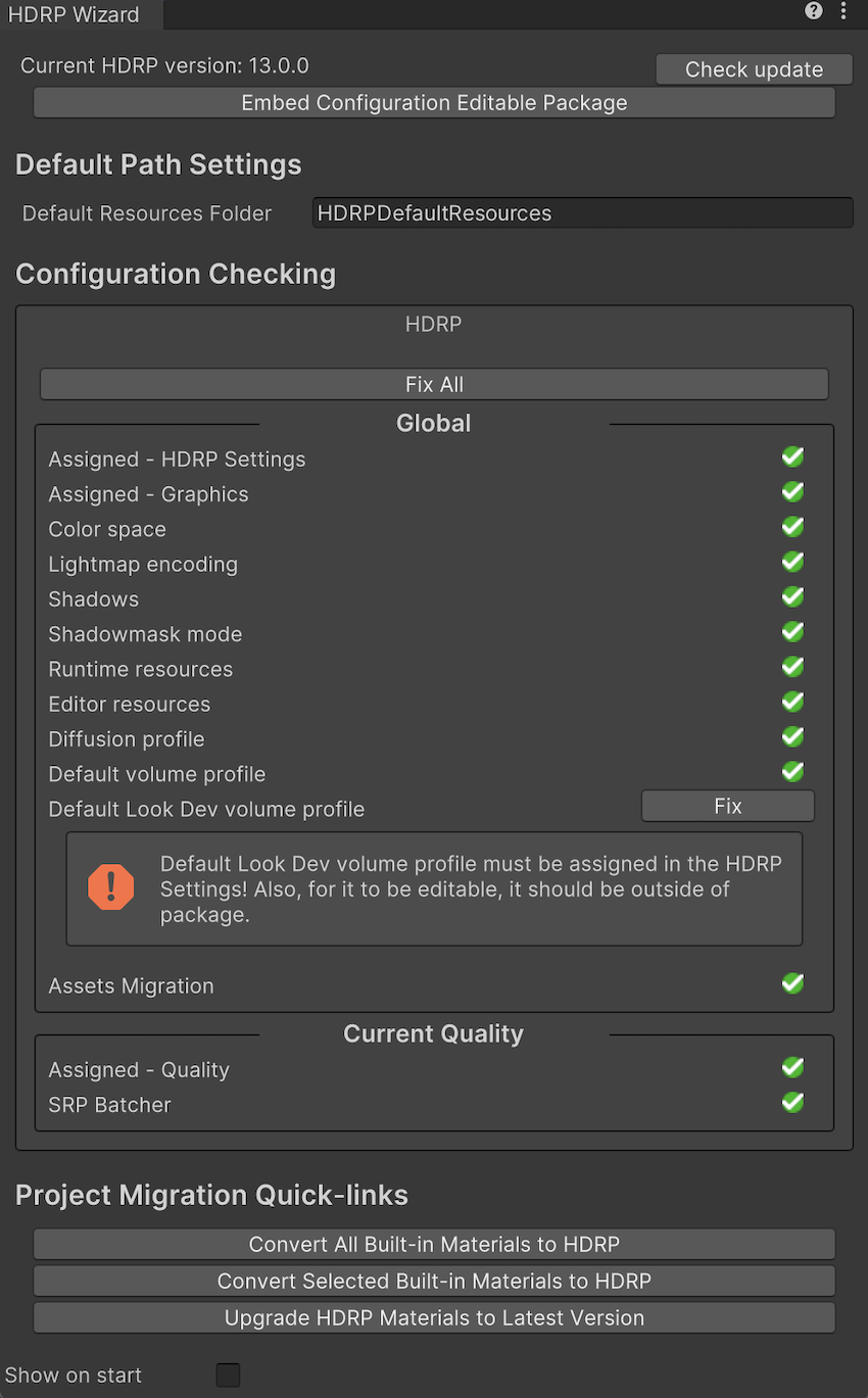 | Shadows | Checks to make sure Shadow Quality is set to All. Unity hides this option when you install HDRP, and automatically sets it to All. Press the Fix button to set Shadow Quality to All. |