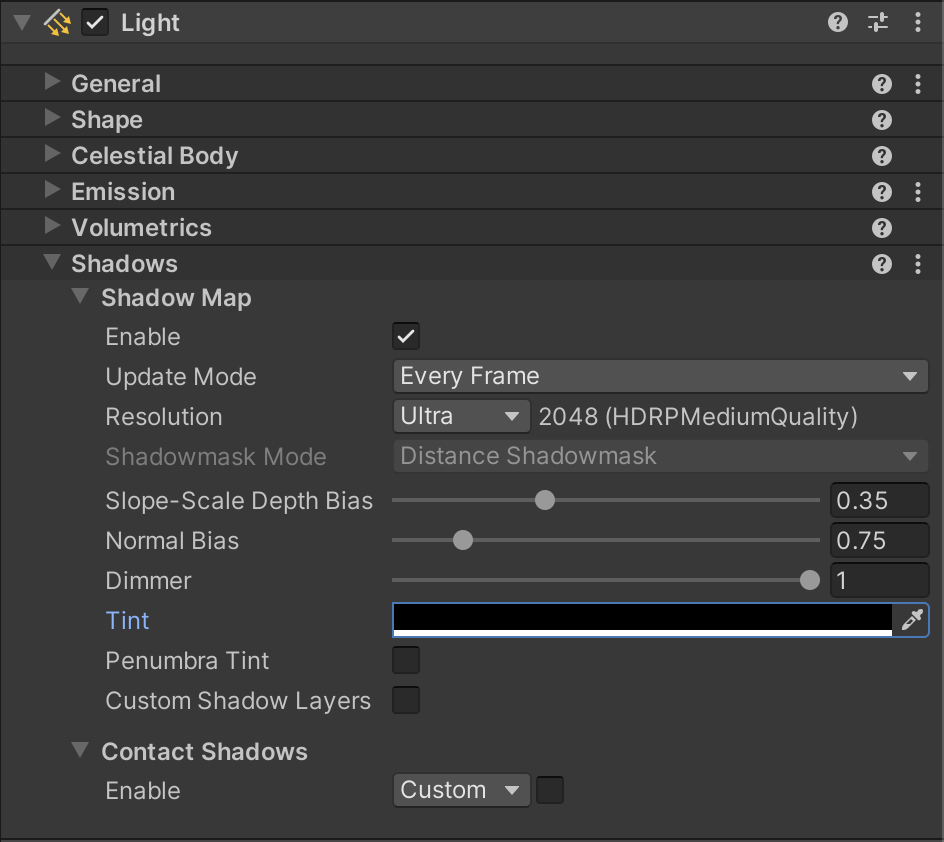 | Distance Shadowmask | Makes the Light cast real-time shadows for all GameObjects when the distance between the Camera and the Light is less than a punctual light’s Fade Distance. See below for the alternative distance property that Directional Lights use. When the distance between the Light and the Camera is greater than the Fade Distance, HDRP stops calculating real-time shadows for the Light. Instead, it uses shadowmasks for static GameObjects, and non-static GameObjects don't cast shadows. |