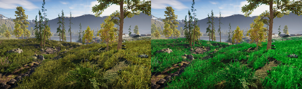 The following image displays grass in an environment scene. In the left image the grass renders correctly. The grass in the right image has the bright green tint that HDRP applies to a Material that doesn't have a valid diffusion profile: