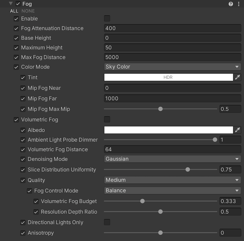 Each Volume Override property has a checkbox on its left. Enable the checkbox to make that property editable. This also tells HDRP to use that property for this Volume component rather than the default value. If you disable the checkbox, HDRP ignores the property you set and uses the Volume’s default value for that property instead.