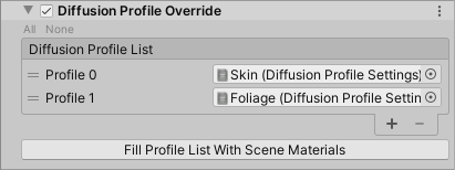 If the Volume with the Diffusion Profile Override is local, the Fill Profiles With Scene Materials button appears. Click this button to fetch the Diffusion Profiles from Materials inside the Volume's bounds and fill the Diffusion Profile List with them. Note that this does not work with Materials that use a ShaderGraph Shader.