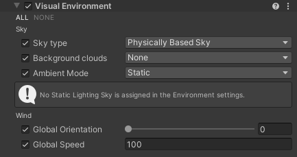 The Visual Environment uses the Volume framework, so to enable and modify Visual Environment properties, you must add a Visual Environment override to a Volume in your Scene.