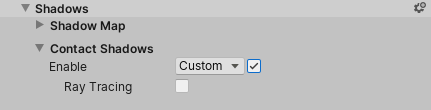 - Select a Light and, in the Inspector, go to Shadows > Contact Shadows and tick the Enable checkbox. This exposes the Ray Tracing property.