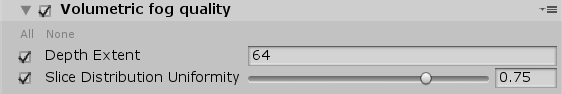 Depth Extent | Determines the distance (in Unity Units) from the Camera at which the volumetric fog section of the frustum ends. |