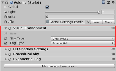 After you have set your Sky Type and Fog Type, if you want to override the default settings, you need to create an override for them on the Volume. For example, if you select Gradient Sky for your Sky Type, click Add Override on your Volume and add a Gradient Sky override. Now you can disable, or remove, the Procedural Sky override because the Visual Environment ignores it and uses the Gradient Sky instead. Disable the checkbox to the left of the Procedural Sky title to disable the override, or click the drop-down menu to the right of the title and select Remove to remove the override.
