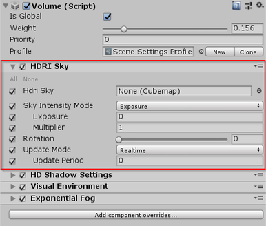 HDRI Sky uses the Volume framework, so to enable and modify HDRI Sky properties, you must add an HDRI Sky override to a Volume in your Scene. To add HDRI Sky to a Volume: