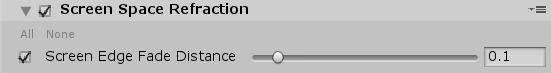 Screen Edge Fade Distance Use the slider to control the distance at which HDRP fades out the refraction effect when the destination of the ray is near the boundaries of the screen. Increase this value to increase the distance from the screen edge at which HDRP fades out the refraction effect for a ray destination.