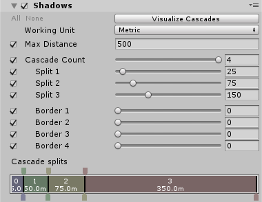| Working Unit | Use the drop-down to select the unit that you want to use to define the cascade splits. • Metric: Defines cascade splits and borders in meters. • Percent: Defines cascade splits and borders as a percentage of Max Distance. |