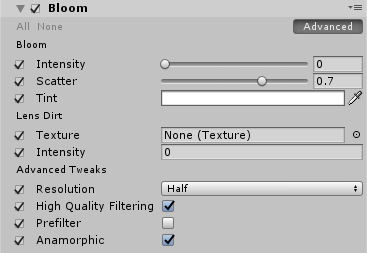 | Anamorphic | Enable the checkbox to make the bloom effect take the Anamorphism property of the Camera into account. This stretches the bloom horizontally or vertically like it would on anamorphic sensors. This property only appears when you enable the advanced properties. |