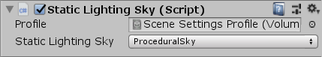 Static Lighting Sky Use the drop-down to select which type of sky to use for the light baking process. The drop-down exposes sky types that the Profile includes as Volume overrides. For example, if the Profile includes the Procedural Sky Volume override, you can select Procedural Sky from this drop-down.