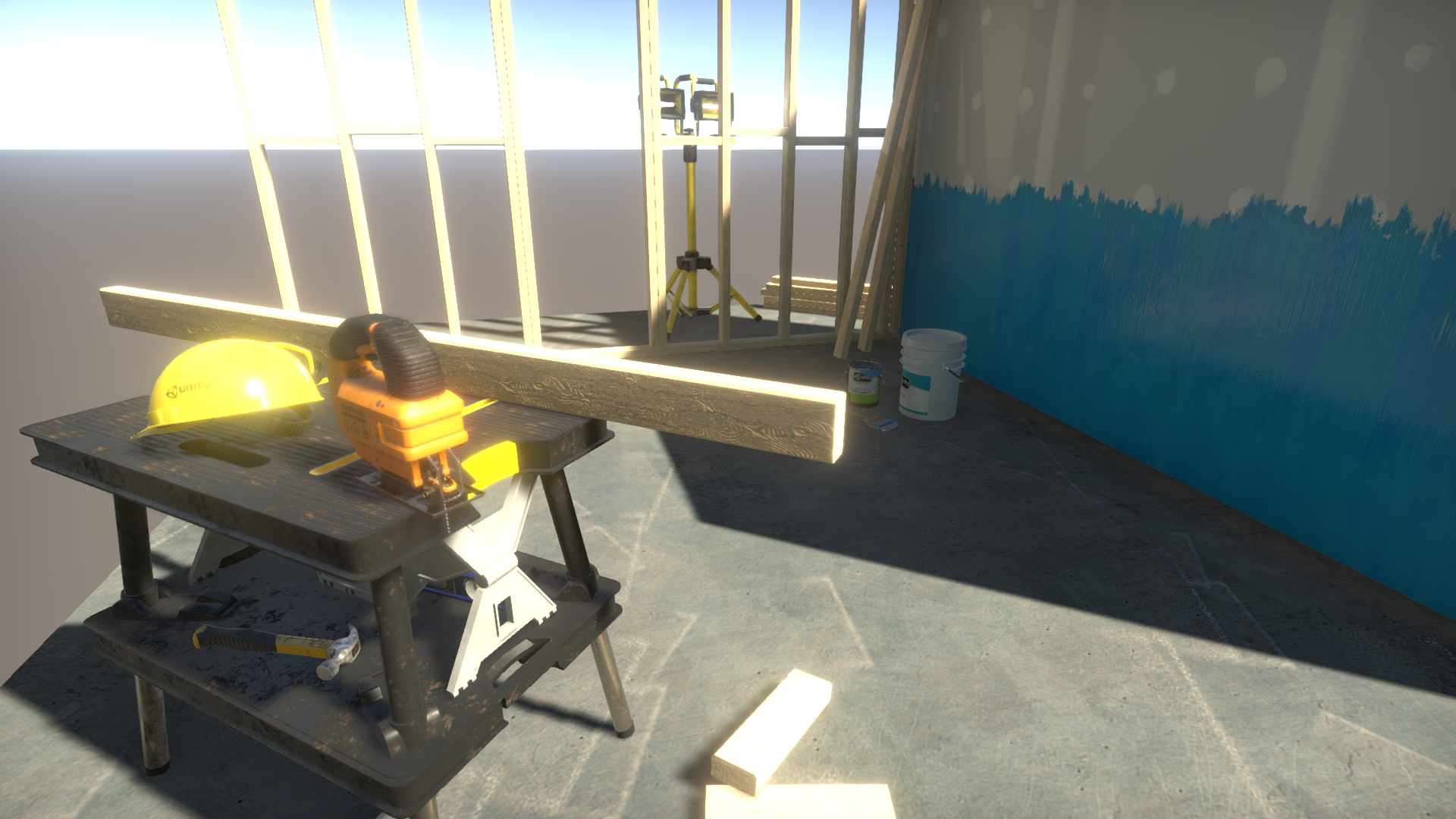 Note how the lighting is different from the original screenshot, and from the original HDRP template. The HDRP template examples were made to look good but were not realistic, whereas this Scene uses physically correct light values: an afternoon direct sun with no clouds in the sky is much brighter than even the best professional construction spotlight. However, the spotlight is still casting light and shadows on the side of the wall.