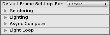 Default Frame Settings For is not just the title of the section, it also corresponds to the drop-down menu, to its right, that allows you to select which component to change the default Frame Settings for. Before you change any Frame Settings, select a component from the drop-down menu. The options are Camera, Baked or Custom Reflection, and Realtime Reflection. After you select a component, you can change the default settings HDRP uses to render a frame using that component. To make Cameras and Reflection Probes use their respective default Frame Settings, disable the Custom Frame Settings checkbox under the General settings of Cameras or under Capture Settings of Reflection Probes.