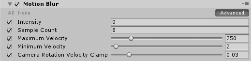 | Intensity | Set the strength of the Motion Blur effect. This scales the magnitude of the velocities present in the velocity buffer. Set this value to 0 to disable Motion Blur. |