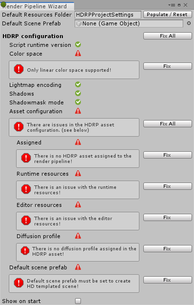 Your Unity Project must adhere to all the configuration tests in this section for HDRP to work correctly. If a test fails, a message explains the issue and you can click a button to fix it. This helps you quickly fix any major issues with your HDRP Project. The Render Pipeline Wizard can load or create any resources that are missing by placing new resources in the Default Resources Folder.