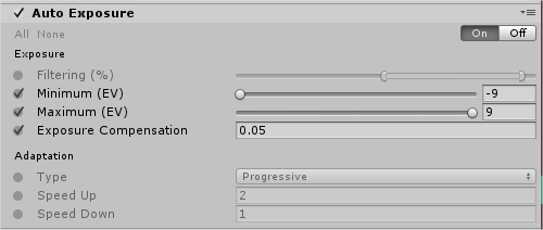 1. Add an Auto Exposure effect to the Post Process Volume script attached to the Post-process Volume GameObject (Add effect > Unity > Auto Exposure).