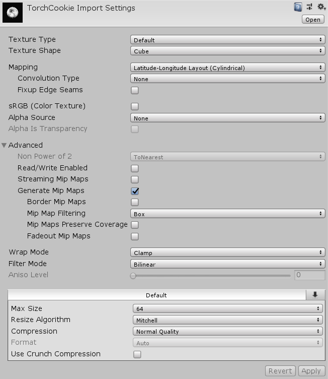You’ll also notice that the Light Cookie no longer works. That’s because HDRP uses standard textures as Light Cookies, and handles colored cookies. Simply change the cookie texture (named "TorchCookie") import settings to these:
