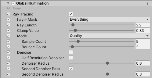 | Ray Tracing | Enable this to make HDRP use ray tracing to evaluate indirect diffuse lighting. This makes extra properties available that you can use to adjust the quality of Ray-Traced Global Illumination. |