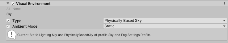 The Visual Environment uses the Volume framework, so to enable and modify Visual Environment properties, you must add a Visual Environment override to a Volume in your Scene.