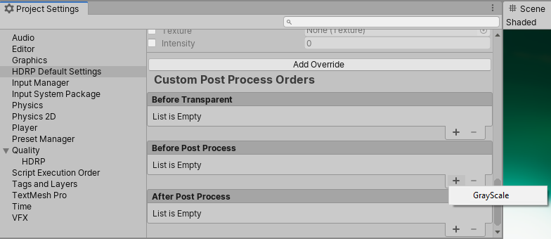 Add the GrayScale effect to the list of custom post-processes that your Project executes. To do this, go to Edit > Project Settings > HDRP Default Settings and, at the bottom of the After Post Process list, click on the + and select GrayScale.