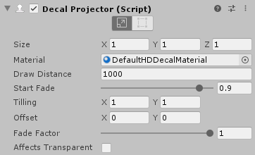 | Size | The 3D size of the projector influence box, and thus the decal. The projector scales the decal to match the X and Z components of the Size. The Decal Projector component projects decals along the local y-axis. |