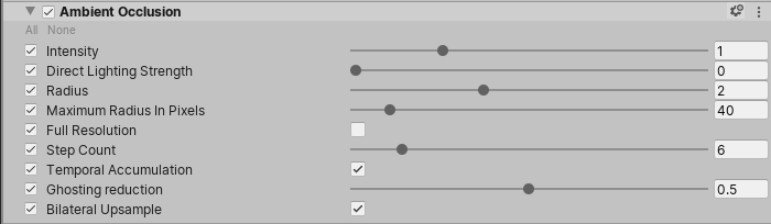 | Temporal Accumulation | Enable the checkbox to accumulate the result of AO over time. This will lead to better quality, but it might result in artifacts like non instant convergence and ghosting. Note: This mode will not lead to good results if motion vectors are not available. |