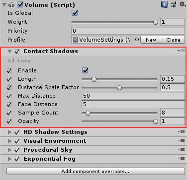 - In the Inspector, navigate to Add Override > Shadowing and click on Contact Shadows. HDRP now applies Contact Shadows to any Camera this Volume affects.