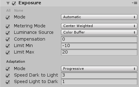 Finally, you can tweak the adaptation speed. This controls how fast the exposure adapts to exposure changes. The human eye adapts slower to darkness than to lightness, so use a lower value for Speed Light to Dark than for Speed Dark to Light.