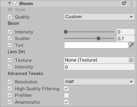 | Anamorphic | Enable the checkbox to make the bloom effect take the Anamorphism property of the Camera into account. This stretches the bloom horizontally or vertically like it would on anamorphic sensors. This property only appears when you enable more options. |