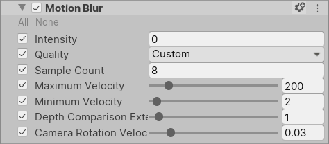 | Intensity | Set the strength of the Motion Blur effect. This scales the magnitude of the velocities present in the velocity buffer. Set this value to 0 to disable Motion Blur. |