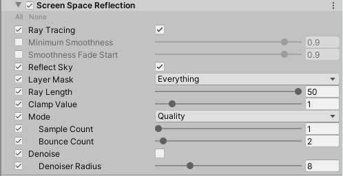 | Ray Tracing | Makes HDRP use ray tracing to process screen-space reflections. Enabling this exposes properties that you can use to adjust the quality of ray-traced reflections. |
