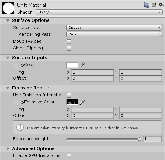 The Unlit Shader lets you create Materials that are not affected by lighting. It includes options for the Surface Type, Emissive Color, and GPU Instancing. For more information about Materials, Shaders and Textures, see the Unity User Manual.