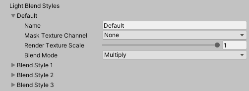 Blend Styles determine the way a particular Light interacts with Sprites in the Scene. All Lights in the Scene must pick from one of the available Blend Styles. The Universal Render Pipeline (URP) 2D Asset can currently contain a total of four different Light Blend Styles, starting with the 'Default' Blend Style being available.