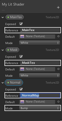 In the Blackboard on the left side, add three new Texture2D items which can be named anything. However, it is required to name the reference for MainTex as _MainTex to render Sprites. It is also recommended to name the references for Mask as _MaskTex and Normal as _NormalMap to match the Shader inputs used in this package.